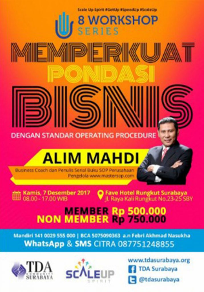 Pada hari Kamis tanggal 7 Desember 2017 di Hotel Fave Rungkut, TDA Surabaya menggelar Workshop 8WS dengan pembahasan “Standar Operating Procedure (SOP)”. Kegiatan ini merupakan rangkaian workshop dengan tema BISNIS “Memperkuat Pondasi Bisnis”.